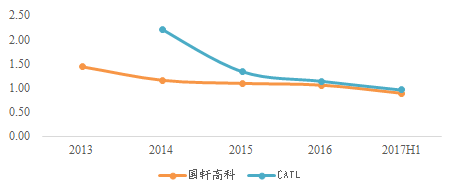 2015-2017年公司動力電池產(chǎn)品價格(稅后)為2.28元、2.06元、1.41元,下滑幅度分別-21.3%、-9.74%、-31.59%,根據(jù)推算,該價格和國軒高科等公司基本一致,并無太大差異。