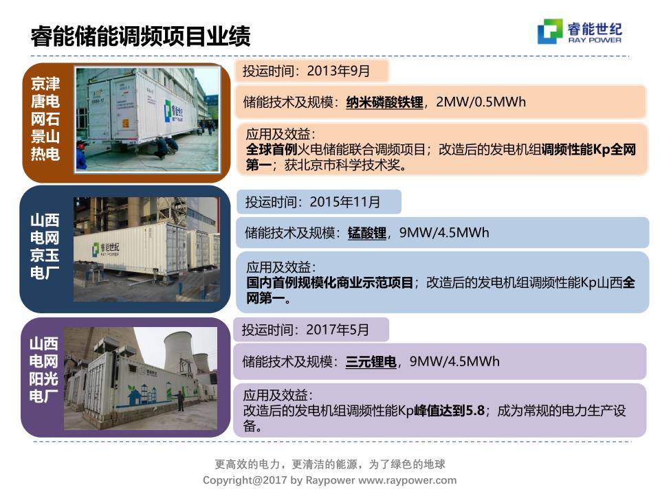 睿能從2011年成立,從我們提出這個(gè)構(gòu)想,在2013年有第一個(gè)項(xiàng)目落地,這也是全國第一個(gè)儲(chǔ)能火電聯(lián)合調(diào)頻的項(xiàng)目。這個(gè)項(xiàng)目在北京石景山熱電用2MW的儲(chǔ)能,配一個(gè)22萬的機(jī)組,220MW的機(jī)組。當(dāng)時(shí)我們用的系統(tǒng)是美國公司納米磷酸鐵鋰電池。這個(gè)項(xiàng)目應(yīng)該算是比較成功的示范項(xiàng)目,當(dāng)時(shí)我們做出來之后,在調(diào)頻性能上加了儲(chǔ)能之后,這臺機(jī)組能夠做到京津唐電網(wǎng)第一名。