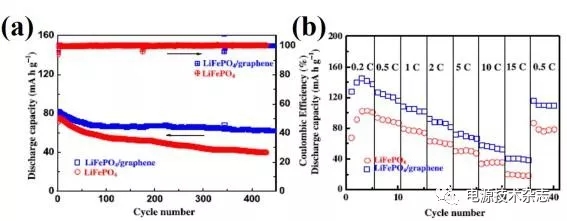 LiFePO4也是鋅基鋰電池理想的正極活性物質(zhì)。Yuan等采用水熱法合成了LiFePO4和石墨烯的復(fù)合物,并首次運(yùn)用在鋅基鋰體系中。6LiFePO4為電池提供高容量(145 mAhg-1),石墨烯為電子在正極中的傳輸提供快速遷移的通道。450圈循環(huán)后,LiFePO4/石墨烯復(fù)合正極容量保持率高達(dá)87.5%,且?guī)靷愋时3?00% (圖3a)。在15C高倍率充放電下,電池的容量為40mAhg-1,表現(xiàn)出優(yōu)異的倍率性能(圖3b)。與LiMn2O4相比,LiFePO4具有更高的理論容量和更低的工作電壓,因此在水系電池中有著光明的應(yīng)用前景。