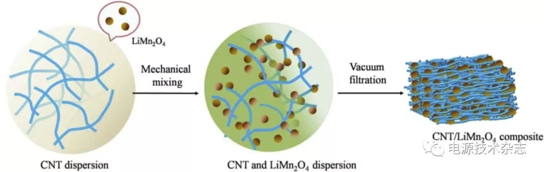 圖4 無(wú)粘結(jié)劑的LiMn2O4-碳納米管復(fù)合電極的制備