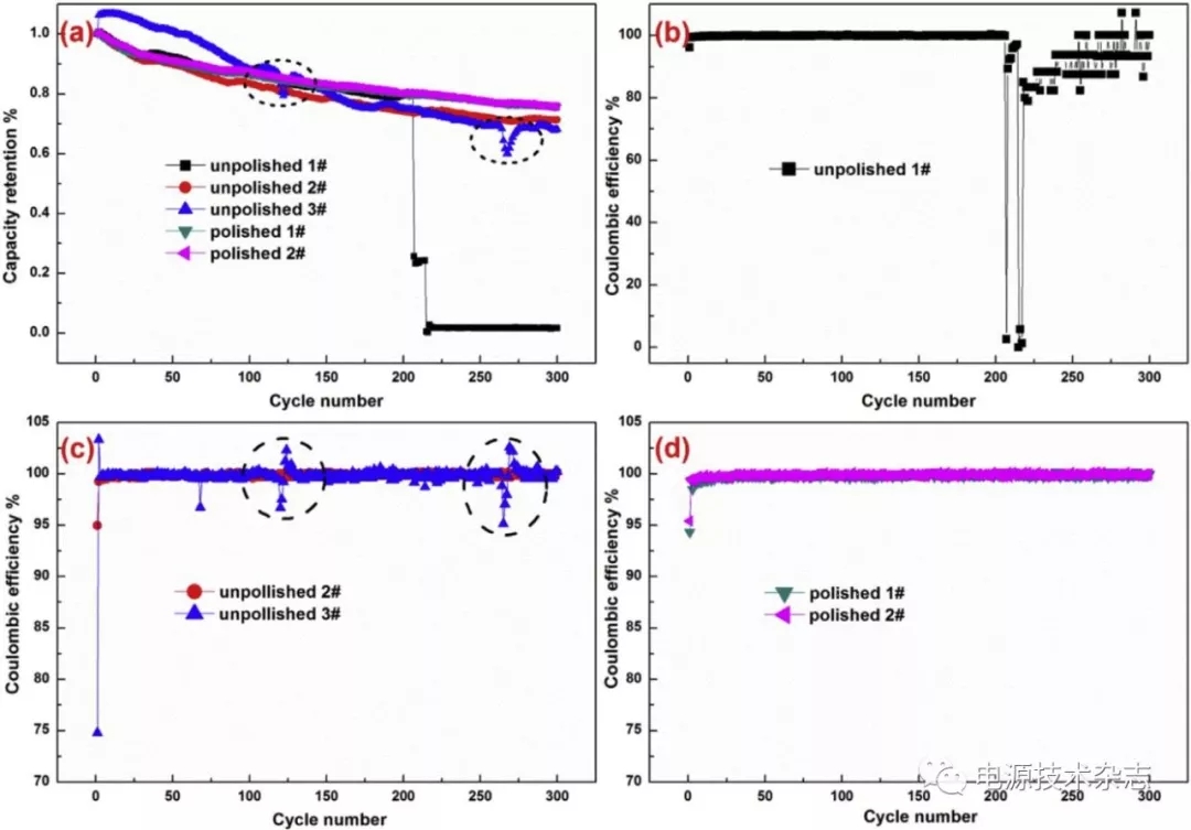 圖8 未拋光三種商用金屬鋅負(fù)極1#,2#,3#和拋光1#,2#鋅負(fù)極的循環(huán)性能(a)以及庫(kù)倫效率(b-d)