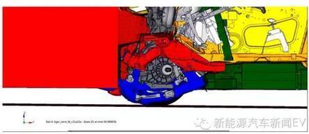從圖片上可以看出,正面碰撞時(shí)車架接凹進(jìn)去了,而電池包模組部分(綠色部分)沒有任何的變形。