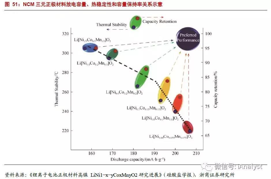 根據(jù)公開(kāi)科技文獻(xiàn),三元材料具有和鈷酸鋰類似的α-NaFeO2型層狀巖鹽結(jié)構(gòu),適合鋰離子的嵌入與脫出,較橄欖石型的磷酸鐵鋰正極材料,在充放電倍率等性能上有更大優(yōu)勢(shì),使得三元鋰電池較磷酸鐵鋰電池更具能量密度優(yōu)勢(shì)。圖50為三元正極材料制作過(guò)程及晶體結(jié)構(gòu)。鎳鈷錳酸鋰通過(guò)調(diào)配鈷、錳、鎳三種材料的比例,獲得不同的電極特性,如圖51所示。在可承受的熱穩(wěn)定性和容量保持度(capacity retention)范圍內(nèi),采用高鎳三元材料作為鋰離子電池正極材料,可以提高放電容量(discharge capacity),進(jìn)而提高電池能量密度。理論上講,應(yīng)用基于鎳酸鋰改性的高鎳三元正極材料,有望助力電池能量密度達(dá)到300Wh/kg。