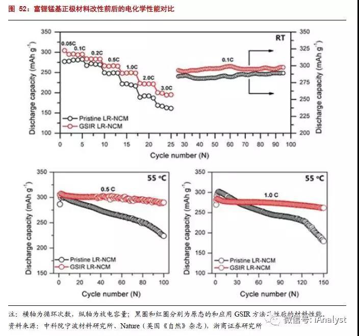 根據(jù)中科院寧波材料技術(shù)與工程研究所(簡(jiǎn)稱“中科院寧波材料所”,未來(lái)或更名為“中科院寧波工業(yè)技術(shù)研究院”)于2016年4月發(fā)布的《鋰離子電池富鋰錳基正極材料技術(shù)專利分析報(bào)告》,富鋰錳基正極材料亦存在限制其商業(yè)化應(yīng)用的諸多缺陷,比如:首次不可逆容量過(guò)高、倍率性能較差、循環(huán)過(guò)程中存在電壓衰減、體積能量密度較低、常規(guī)碳酸脂基電解液難以與其匹配等。為了推動(dòng)富鋰錳基正極材料產(chǎn)業(yè)化,需要對(duì)其優(yōu)化改性,如表面包覆、元素?fù)诫s、表面脫鋰處理、引入尖晶石相,以及開(kāi)發(fā)與其相匹配的高壓電解液,等等。圖52為中科院寧波材料所在富鋰錳基正極材料改性方面的研究,改性后材料的放電容量衰減曲線更為優(yōu)化。