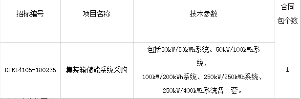 近日,中國電力科學研究院有限公司發(fā)布集裝箱儲能系統(tǒng)采購招標公告,招標內(nèi)容包括50kW 50kWh系統(tǒng),50kW 100kWh系統(tǒng)、100kW 200kWh系統(tǒng)、250kW 250kWh系統(tǒng)、250kW 400kWh系統(tǒng)各一套