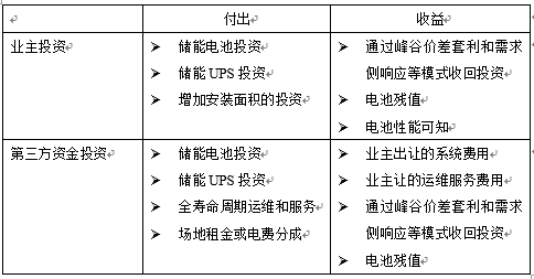 當(dāng)數(shù)據(jù)中心想做成儲(chǔ)能型的數(shù)據(jù)中心,其投資模式亦可發(fā)展改變。如果建設(shè)數(shù)據(jù)中心的業(yè)主愿意投資,則可以投資并獲得全部收益;如果業(yè)主覺得看不清楚趨勢,尚有風(fēng)險(xiǎn),亦可由第三方資本進(jìn)行投資,做合同能源管理(EMC),具體的投資收益分成,業(yè)主可以和第三方資本協(xié)商。筆者通過下表簡單分析了分別由業(yè)主自己投資和第三方資本投資各自所付出的以及所得到的回報(bào),供大家參考,不排除未來更靈活的收益模式或更豐富的合作模式!