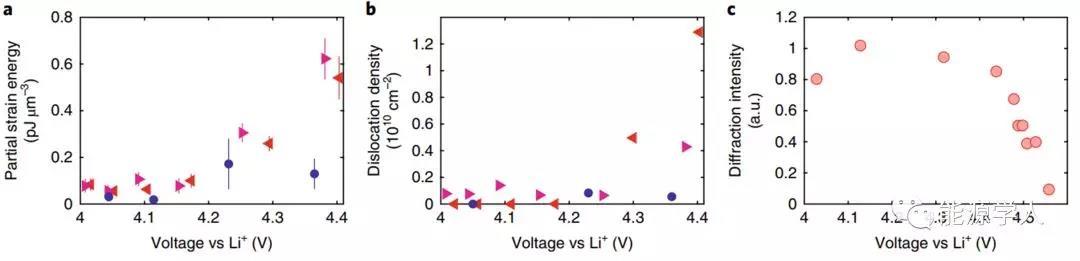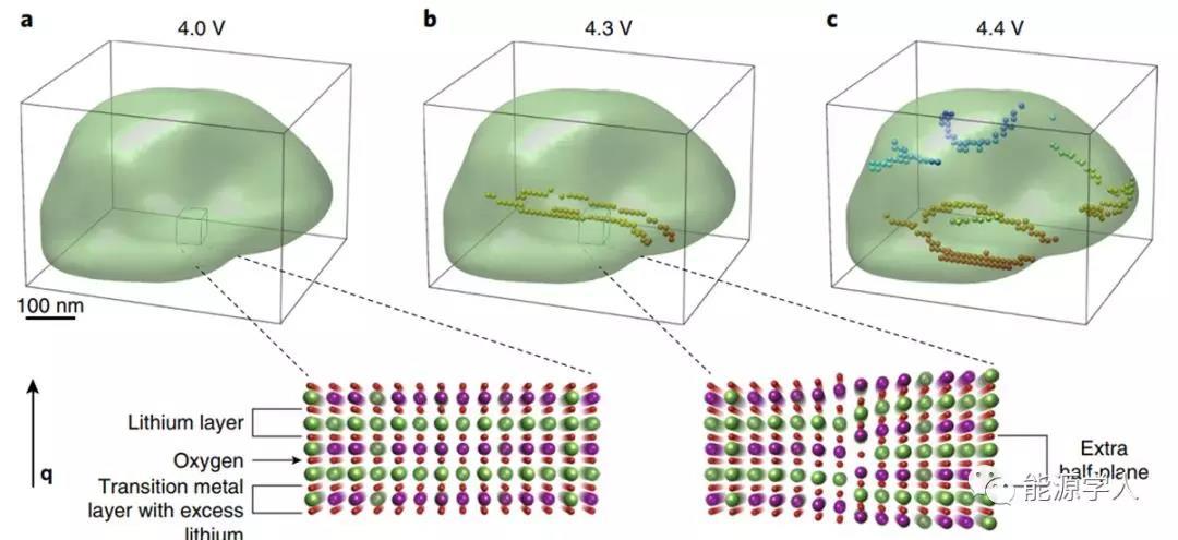 圖1. 在充電期間形成位錯網(wǎng)絡(luò)(a)在4.0V的電荷狀態(tài)下,在顆粒中未觀察到位錯;(b)在4.3V時,在鋰脫出過程中形成了兩個邊緣位錯;(c)4.4 V時出現(xiàn)位錯網(wǎng)絡(luò)