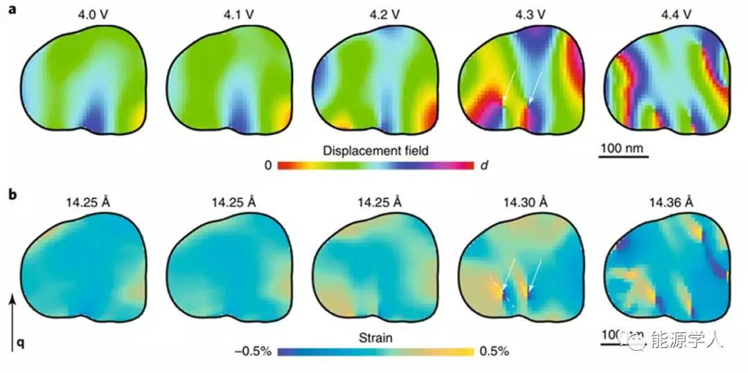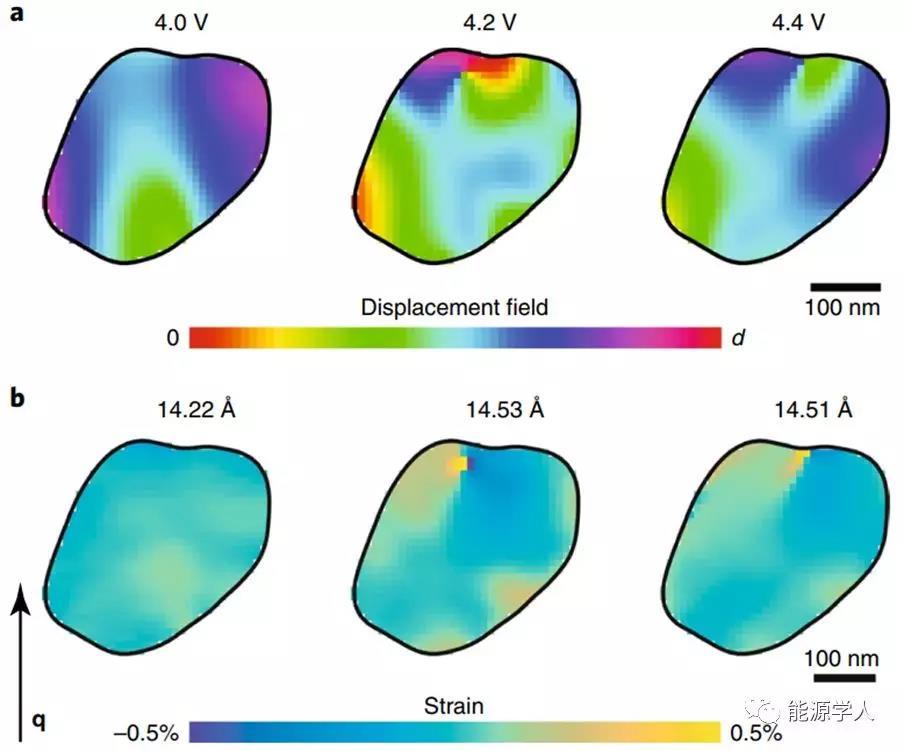 圖3. 在充電期間原位變化NCA納米顆粒。在充電期間原位捕獲的單個NCA顆粒沿(001)方向(垂直于層)的位移場(a)和應(yīng)變(b)