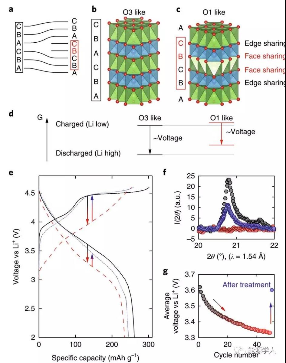 圖5. 恢復(fù)富鋰氧化物材料中的電壓的路徑。(a-c)由部分位錯誘導(dǎo)的氧層堆積修飾的示意圖,由部分位錯誘導(dǎo)的氧層堆積修飾的示意圖(a),兩個額外的氧層O3序列ABCABC(b)分解O1樣序列ABC BC ABC(c);(d)在吉布斯自由能圖中,邊緣共享八面體導(dǎo)致能量上最有利的配置。(e)Li-金屬作為陽極的富鋰層狀陰極的充放電電壓曲線;(f)在50個循環(huán))以及在熱處理之后結(jié)構(gòu)峰強度的演變;(g)在2032型半電池中測量的前50個循環(huán)(黑色至紅色符號)和熱處理后(藍色符號)的平均放電電壓,處理后恢復(fù)放電電壓。