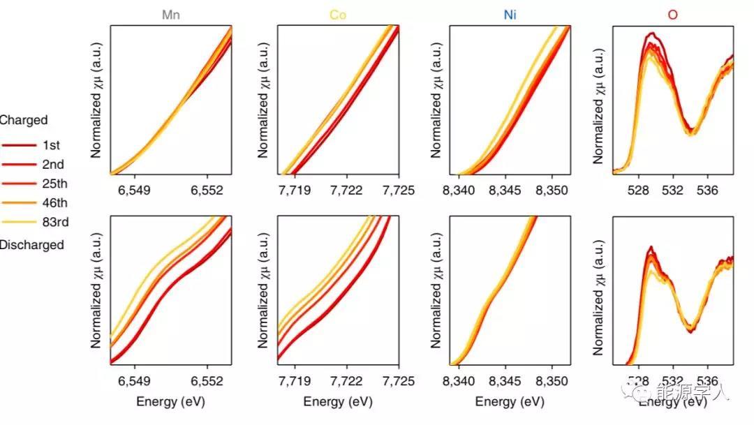 圖2.Li1.2Ni0.15Co0.1Mn0.55O2在不同循環(huán)次數(shù)下不同元素的XAS