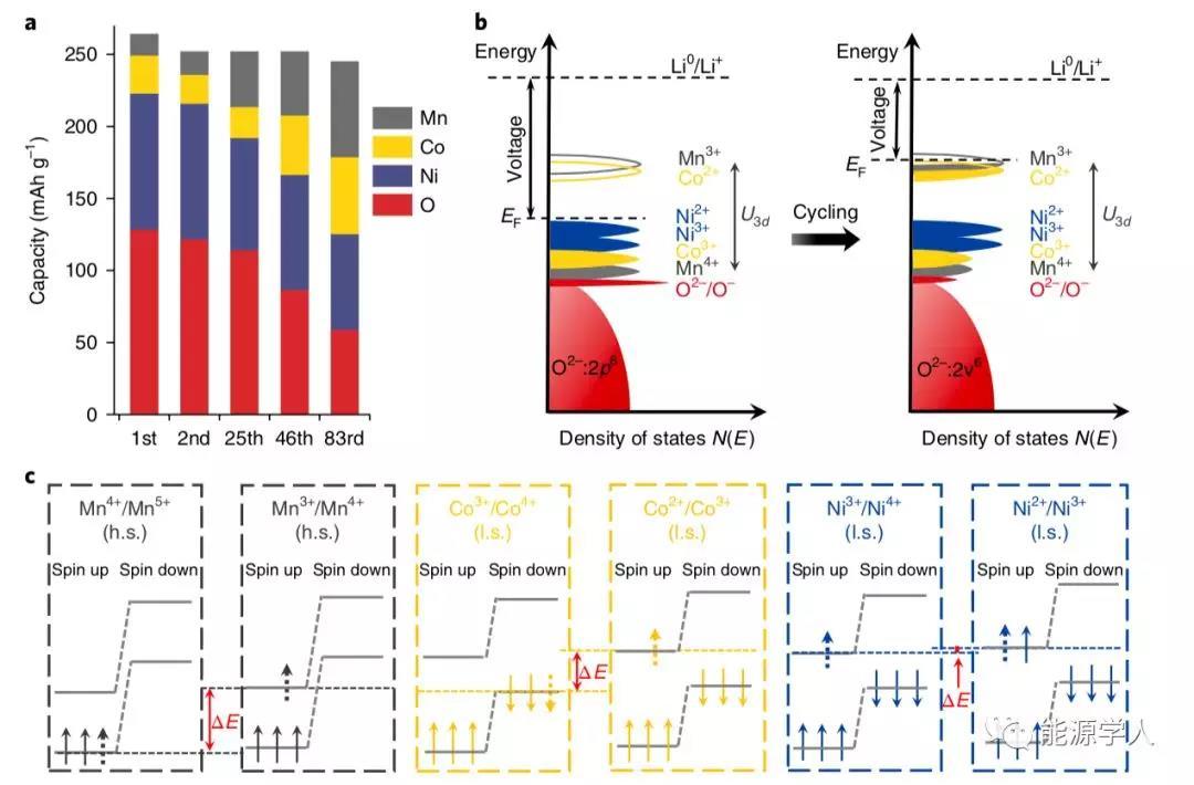 圖3.Li1.2Ni0.15Co0.1Mn0.55O2氧化還原的演變過程。(a)不同循環(huán)圈數(shù)下每種元素的對放電容量的貢獻,(b)由于電子結(jié)構(gòu)變化導(dǎo)致費米能級升高的佐證(c)對于不同的氧化還原電對,Mn和Co將涉及不同的能級。