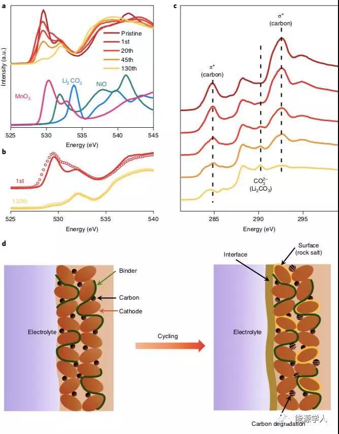 圖4.Li1.2Ni0.15Co0.1Mn0.55O2的表面降解產(chǎn)生更高的過電位。(a)樣品在不同循環(huán)圈數(shù)下充電態(tài)的PEY O K-edge XAS,(b)第1和第130圈時充(圓圈)放電(曲線)樣品的PEY O K-edge XAS,(c)樣品在不同圈數(shù)下的PEY O K-edge XAS,(d)演示Li1.2Ni0.15Co0.1Mn0.55O2活性材料的界面形成和表面重建,以及循環(huán)過程中碳添加劑的降解過程。