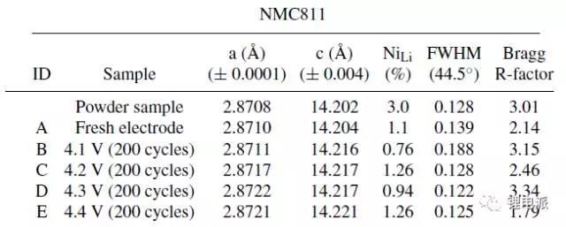 1.未循環(huán)的極片晶格常數(shù)和NCM811活物質(zhì)粉末的晶格常數(shù)是一致的。循環(huán)截止電壓是4.1V時,其晶格常數(shù)也與前兩者無明顯區(qū)別,c軸有少量增加。再看循環(huán)截止電壓為4.2V、4.3V、4.4V的c軸晶格常數(shù),與4.1V的無明顯區(qū)別(差異為0.004埃),而在a軸上的數(shù)據(jù)就差異比較大了。