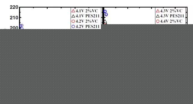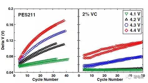 可以看出,在低截止電壓下循環(huán),電池△V較小,而電壓升高到4.3V以上時,△V急劇升高,電池極化加重,這就大大影響了電池的壽命。從圖中也可以看出,VC和PES211的△V變化速率是不同的,這進一步驗證了電解液添加劑不同,電池極化程度、速度也是不同的。