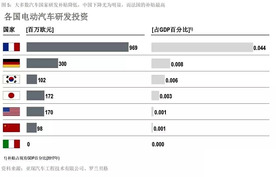 羅蘭貝格的《2018全球電動汽車發(fā)展指數(shù)》(以下簡稱指數(shù))也顯示,從政府層面“對電動汽車研發(fā)的支持正在減少,部分國家經(jīng)費持續(xù)降低。政府研發(fā)項目已經(jīng)接近尾聲,目前也沒有新的項目上馬;即使有,規(guī)模也非常有限。”其中,去年中國政府在電動汽車研發(fā)投資9800萬歐元,占比GDP0.1%。相比而言,法國的投入則占比GDP4.4%。