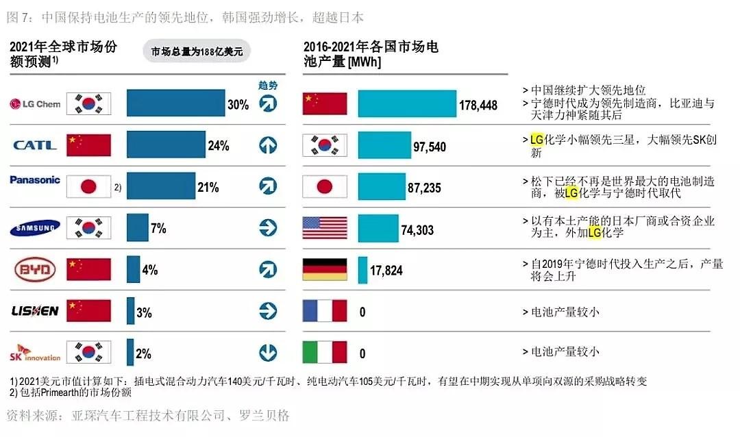 至2021年,中國、韓國、日本、美國、德國將位列全球電池產(chǎn)量前五,而電池市場總量將達188億美元(插混汽車140美元/千瓦時、春點汽車105美元/千瓦時),在全球市場份額中,LG將占比30%;寧德時代占比24%、松下占比21%、三星占比7%、比亞迪占比4%。