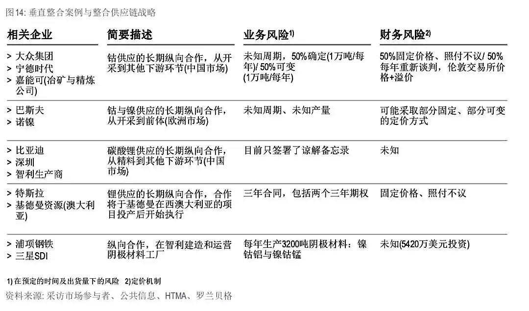 例如大眾集團、寧德時代便與嘉能可(冶礦與精煉公司)展開鈷供應(yīng)的長期縱向合作。價格采用50%確定(1萬噸/年)/50%可變(每年重新談判,倫敦交易所價格+溢價)進行。