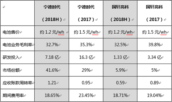 由于寧德時代和國軒高科動力電池業(yè)務比較純粹,新浪財經(jīng)選取行業(yè)第一和第三的這兩家公司,通過從電池售價、電池成本、毛利率水平、市場份額、研發(fā)投入、應收賬款(現(xiàn)金流)以及期間費用等指標的對比,或許從中能夠窺見龍頭公司經(jīng)營情況的一些端倪。