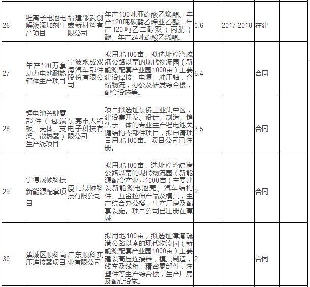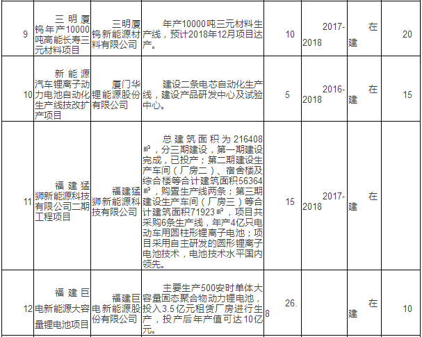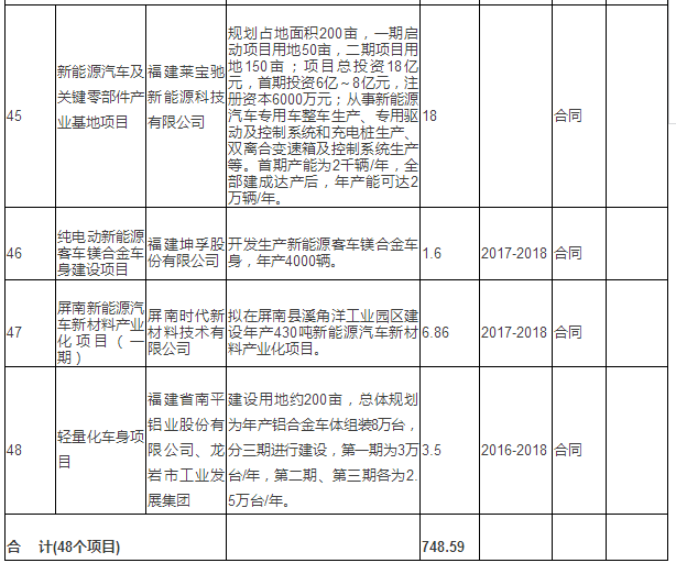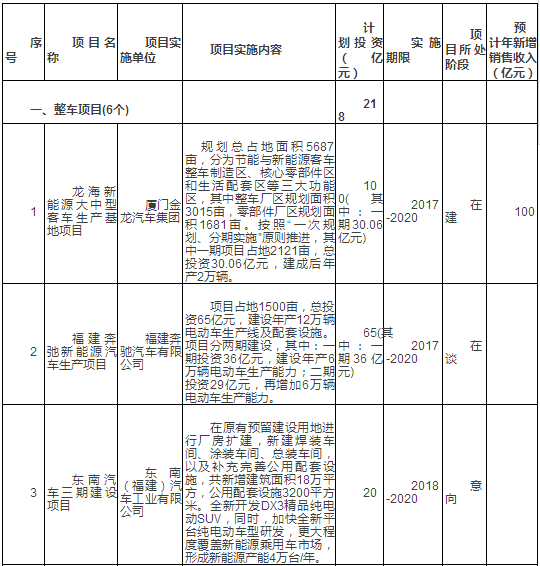 新能源汽車產(chǎn)業(yè)重點項目表