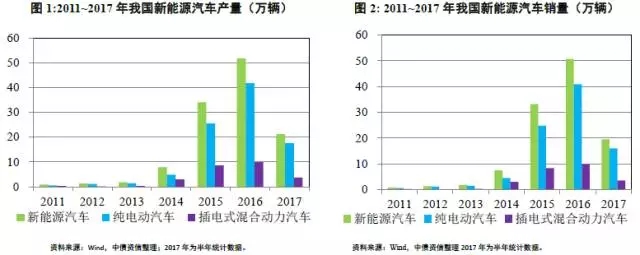 由于新能源汽車所受到的政策傾斜、財(cái)政補(bǔ)貼和優(yōu)先配置等實(shí)際便利,從2014年開始,特別以一線城市對(duì)新能源汽車的需求增長為契機(jī),我國新能源汽車市場開始快速增長。如圖1和圖2所示的新能源汽車的產(chǎn)銷情況,2011~2013年市場規(guī)模非常小,發(fā)展較慢;從2014年開始明顯增快,到2016年,我國新能源汽車產(chǎn)量51.7萬輛,銷量50.7萬輛,基本實(shí)現(xiàn)了前述《規(guī)劃》所設(shè)定的2015年新能源汽車市場達(dá)到50萬輛的發(fā)展目標(biāo),但相比同期我國汽車市場總體2,811.88萬輛和2,802.82萬輛的總產(chǎn)銷量規(guī)模,新能源汽車這一細(xì)分市場的依然十分微小,占比不足2%。