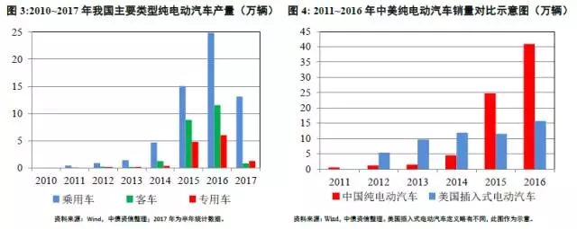 此外,中美兩國的電動(dòng)汽車市場銷量情況對(duì)比也可以一定程度上反映中外新能源汽車市場發(fā)展的狀態(tài)。根據(jù)可獲得的從2012年開始的美國統(tǒng)計(jì)數(shù)據(jù),美國的插入式電動(dòng)汽車經(jīng)歷著較為快速的增長,年均增長幅度34.5%,2016年銷量15.7萬輛;同時(shí)期中國純電動(dòng)汽車的年均增長幅度,達(dá)到了171.1%,2016年銷量40.9萬輛。由于兩國統(tǒng)計(jì)口徑和汽車類型定義的差異,此對(duì)比僅作參考,如圖4所示。