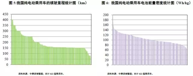乘用車方面,現(xiàn)階段422型車的續(xù)駛里程從80km~450km不等,最多數(shù)的車型續(xù)航里程眾數(shù)值155km,中數(shù)值160km,基本能達(dá)到《規(guī)劃》的發(fā)展目標(biāo);僅有48型車的續(xù)駛里程在300km及以上。其中,有2型車?yán)m(xù)駛里程達(dá)到450km,該2型車的質(zhì)量均為2,450kg,動(dòng)力電池質(zhì)量730kg,能量密度124.7Wh/kg。從動(dòng)力電池的能量密度角度看,目前主要分布在50.5Wh/kg~199.4Wh/kg范圍內(nèi),眾數(shù)值94.4Wh/kg,中數(shù)值101.3Wh/kg,同時(shí)僅有7款車型的能量密度達(dá)到《規(guī)劃》關(guān)于2015年達(dá)到150Wh/kg的目標(biāo),大多數(shù)車型的能量密度集中在80~120Wh/kg的范圍。