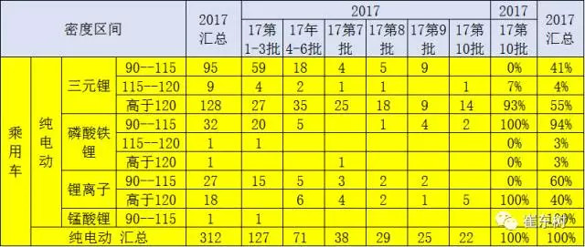 2017年客車電池提升很快,磷酸鐵鋰的占比保持90%以上,第11批磷酸鐵鋰的電池的能量密度達(dá)到115以下僅10%.而錳酸鋰也是基本都是高于115。由于客車的競(jìng)爭(zhēng)相對(duì)充分,大部分客車企業(yè)都能實(shí)現(xiàn)115的補(bǔ)貼鼓勵(lì)要求。客車目前主要貼著補(bǔ)貼推動(dòng),但高于140瓦、千克的新品也是開(kāi)始推出。