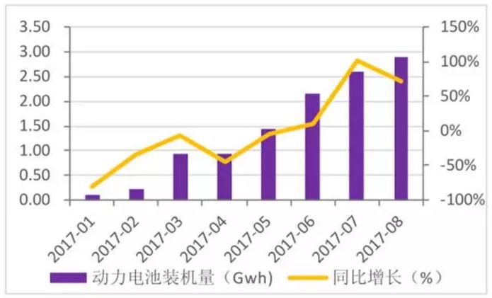 第二季度隨著補貼目錄包含車型數(shù)量的完善、地補落地以及免購置稅目錄錯配的逐漸解決,新能源汽車產(chǎn)銷數(shù)據(jù)逐步提升,行業(yè)開始回暖。截止到2017年8月,中國新能源汽車市場動力鋰離子電池裝機總量高達2.92GWh ,與2016年8月的1.69GWh相比,同比大增73.4%。