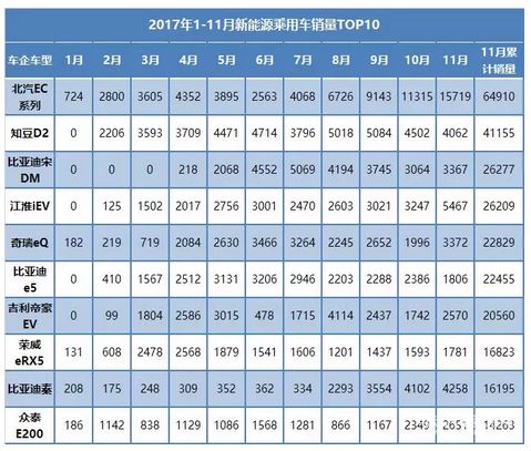 從車企表現(xiàn)看,2017年1~11月,比亞迪以9.6萬臺的累計(jì)銷量位居冠軍,北汽新能源憑借EC180的銷量排在第二位;吉利汽車排在了第三位,累計(jì)銷售4.5萬臺。值得注意的是,北汽新能源11月新能源乘用車銷量為1.9萬臺,預(yù)計(jì)12月銷量將突破2萬臺,全年銷量有望突破10萬臺。從全年累計(jì)銷量來看,電動(dòng)汽車資源網(wǎng)認(rèn)為比亞迪和北汽新能源都將有奪得冠軍寶座的可能,比亞迪的勝算應(yīng)該會更大一些。