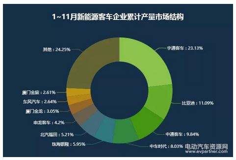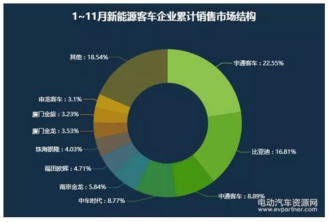 從1-11月累計(jì)產(chǎn)量看,宇通客車?yán)^續(xù)保持優(yōu)勢地位,是目前唯一一個(gè)累計(jì)產(chǎn)量過萬的企業(yè),占比也提升到了23.13%。此外1~11月新能源客車?yán)塾?jì)產(chǎn)量超過五千臺的還有比亞迪和中通客車,分別為5806臺和5153臺。