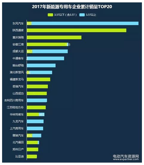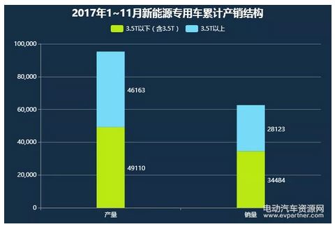 2017年1-11月,3.5T以下(含3.5T)新能源專用車產(chǎn)銷分別完成49110臺(tái)、34484臺(tái);3.5T以上新能源專用車產(chǎn)銷分別完成46163臺(tái)、28123臺(tái)。