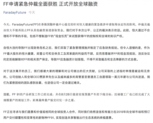 10月25日晚間,F(xiàn)F發(fā)布官方聲明稱:“FF申請緊急仲裁全面獲勝 正式開放全球融資”。然而,車事小說查閱恒大健康發(fā)布的公告內(nèi)容后發(fā)現(xiàn),F(xiàn)F的官方聲明內(nèi)容并不全面。