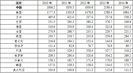 圖表2:2010年-2014年世界主要國家汽車銷量(單位:萬輛)