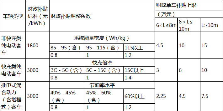 1、新能源公交車(chē)補(bǔ)貼金額=車(chē)輛帶電量x單位電量補(bǔ)貼標(biāo)準(zhǔn)x調(diào)整系數(shù)(調(diào)整系數(shù):系統(tǒng)能量密度/充電倍率/節(jié)油水平),具體如下: