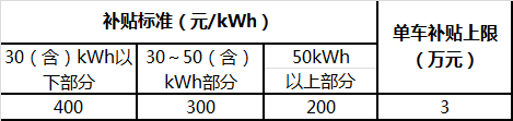 (一)純電動(dòng)貨車(chē)和專(zhuān)用車(chē)以提供驅(qū)動(dòng)動(dòng)力的動(dòng)力電池總儲(chǔ)電量為依據(jù),采取分段超額累退方式給予補(bǔ)貼,具體如下:
