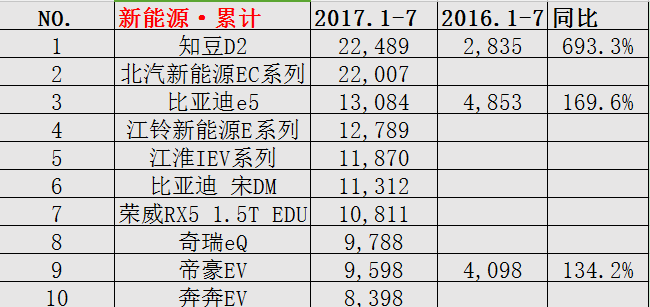 整個2017前七月,新能源銷量前三還是在比亞迪、北汽新能源EC系列、知豆D2中,只不過順序發(fā)生了改變,知豆D2延續(xù)上半年的優(yōu)勢,繼續(xù)問鼎新能源乘用車銷售寶座,北汽新能源EC系列、比亞迪e5仍然分別位列第二和第三。