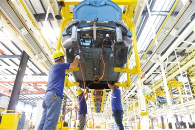 圖為9月2日,在位于江蘇如皋經(jīng)濟(jì)技術(shù)開(kāi)發(fā)區(qū)的陸地方舟純電動(dòng)汽車(chē)生產(chǎn)線(xiàn)上,工人們正在進(jìn)行流水作業(yè)。