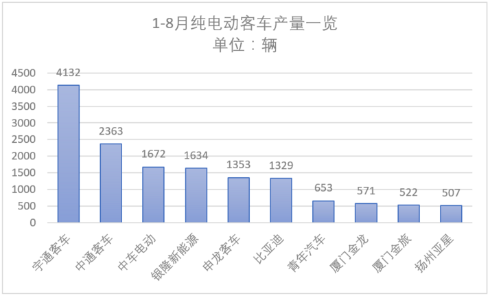 從統(tǒng)計數(shù)據(jù)看,宇通客車1-8月生產(chǎn)純電動客車4132輛,同比下降48%,市場份額21.2%,穩(wěn)居行業(yè)第一;中通客車1-8月生產(chǎn)2363輛,同比下降63%,份額為12.1%。