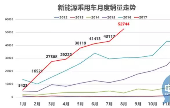 據(jù)乘聯(lián)會(huì)的數(shù)據(jù),2017年8月新能源乘用車銷量創(chuàng)有史以來(lái)單月銷量新高,達(dá)到52744臺(tái),環(huán)比7月增長(zhǎng)1萬(wàn)臺(tái),同比增速72%。