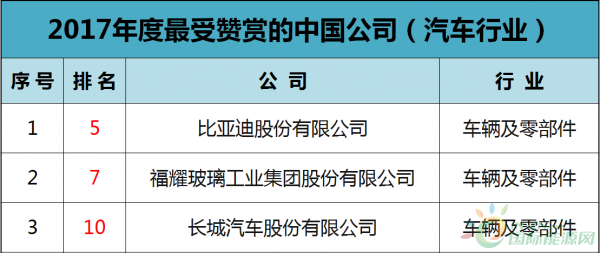 比亞迪、長(zhǎng)城、上汽入榜2017年“最受贊賞的中國(guó)公司” 比亞迪居汽車榜榜首