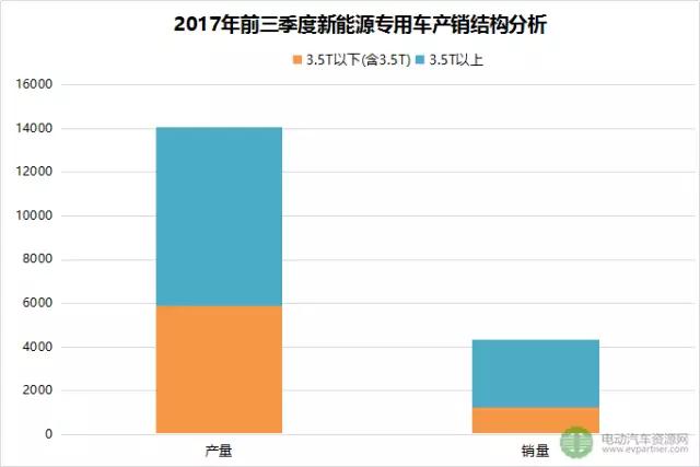 2017年前三季度,3.5T以下(含3.5T)的新能源專(zhuān)用車(chē)產(chǎn)銷(xiāo)分別完成23237臺(tái)和10814臺(tái),3.5T以上的新能源專(zhuān)用車(chē)產(chǎn)銷(xiāo)分別完成20405臺(tái)和8405臺(tái)。