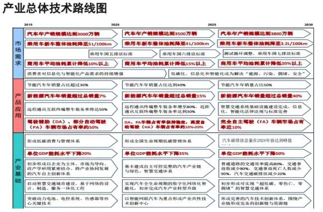 對(duì)于產(chǎn)業(yè)總路線圖可以重點(diǎn)關(guān)注幾組數(shù)據(jù)。以2020年、2025年、2030年為節(jié)點(diǎn),總路線圖重點(diǎn)指出了不同時(shí)間節(jié)點(diǎn)汽車產(chǎn)業(yè)規(guī)模、新能源車銷量占比和智能汽車的市場(chǎng)占有率。