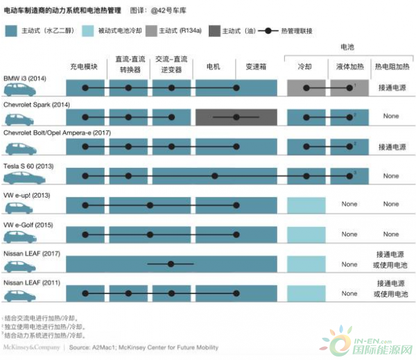 我們也發(fā)現(xiàn)了熱管理的設(shè)計(jì)方法有著巨大的區(qū)別,比如電池冷卻系統(tǒng)就有四種不同的方案:被動(dòng)式(自然風(fēng)冷),主動(dòng)式結(jié)合動(dòng)力系統(tǒng)的,主動(dòng)式獨(dú)立用于電池的,主動(dòng)式結(jié)合空調(diào)電路的。