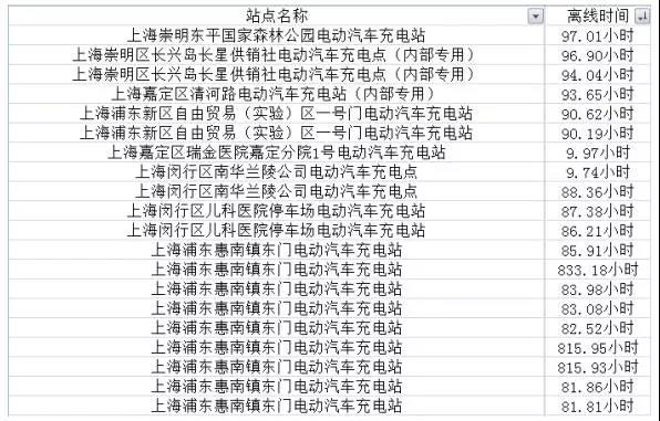 圖2 上海充電樁離線時(shí)間統(tǒng)計(jì)表部分