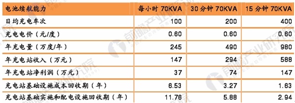 總體來看,單個充電站基礎設施和配電設施投資額不算大,如果電池續(xù)航能力能夠達到半小時70KVA以上,充電站成本回收期能控制在6年以內,單個充電站基礎設施和配電設施投資在430萬元左右。