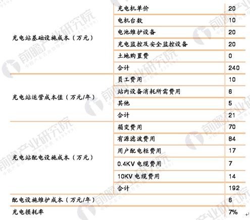 充電站成本分為三大部分:基礎設施成本、配電設施成本、運營成本。目前很多充電站均是由省網公司和當?shù)卣?lián)合建設,很多用地均為政府劃撥,土地購臵費較低,在對充電站基礎設施成本的判斷中,假設土地購置費用為0。