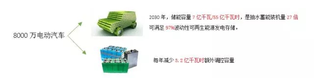 一是車載電池,按照2030年全國電動(dòng)汽車保有量達(dá)到8000萬輛的預(yù)測(cè),電動(dòng)汽車每年充電需求將達(dá)到4100億千瓦時(shí),理論儲(chǔ)能容量達(dá)到7億千瓦/55億千瓦時(shí),其功率儲(chǔ)能的容量約為目前全國抽水蓄能裝機(jī)量的27倍。2030年風(fēng)電,光伏發(fā)電電量將達(dá)到42.1億千瓦時(shí),則僅電動(dòng)乘用車的有效儲(chǔ)能容量即可滿足97%波動(dòng)性可再生能源日發(fā)電量的存儲(chǔ),如果電動(dòng)汽車能夠有序充放電,則可以減少額外投資而獲得的巨大調(diào)控容量。