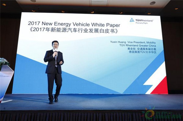 圖為:TUV萊茵大中華區(qū)交通服務(wù)副總裁黃余欣發(fā)布《2017年中國新能源汽車行業(yè)發(fā)展白皮書》