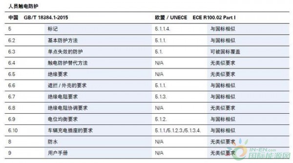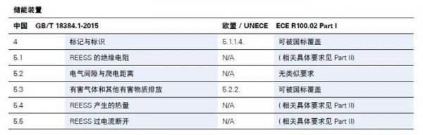 可以看到在常規(guī)電氣安全方面,中國方面最主要的標準是GB/T 18384系列標準,其主要修改采用了ISO 6469系列標準;歐盟主要的法規(guī)是ECE R100的02修訂本,其中第一部分是針對整車的安全要求,第二部分是針對REESS即儲能裝置的零部件認證要求,在下表中列出了國標在儲能裝置,操作安全及故障防護,人員觸電防護方面的法規(guī)條目,以及歐標與國標的條目對照和內(nèi)容異同。美國對于常規(guī)電氣安全則并沒有強制的標準。
