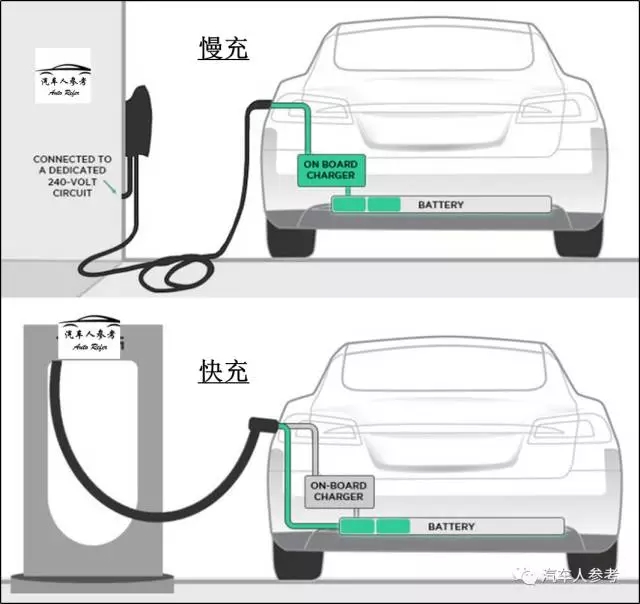 現(xiàn)在市場上電動汽車交流慢充是標配,直流快充是選配。對于快慢充兼具的電動汽車,比如特斯拉,在快充模式下,可以直接繞過車載充電器,由充電樁直接連接電池進行充電,見下圖。